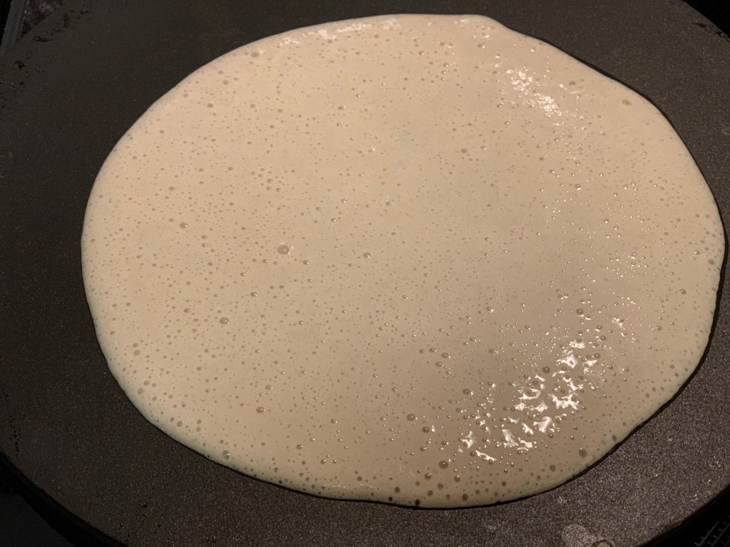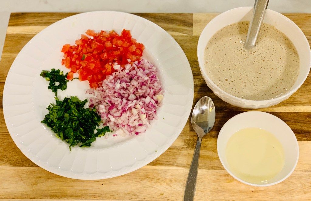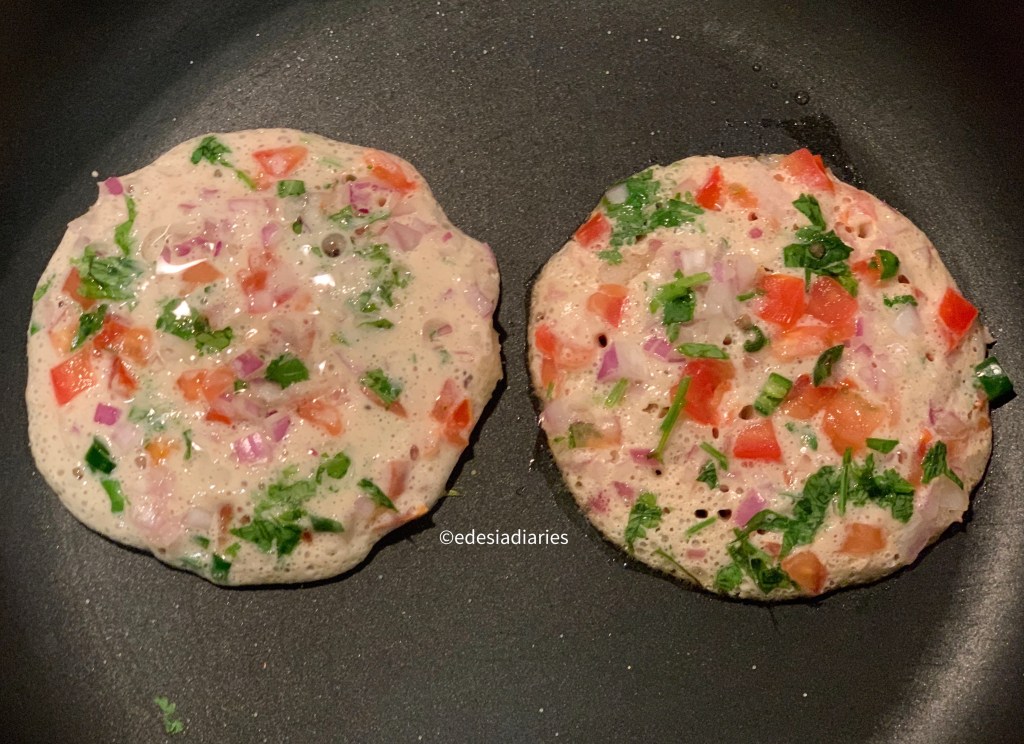 - Pour the batter on the skillet, spread it in a circular shape and sprinkle chopped tomatoes, onions, cilantro, and chilies evenly.