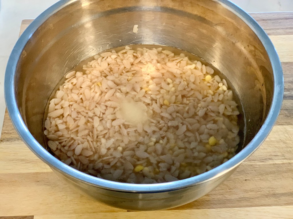 Generally, lentils and beaten rice are soaked separately because beaten rice takes lesser time to absorb water. I soaked everything together to keep things simple.