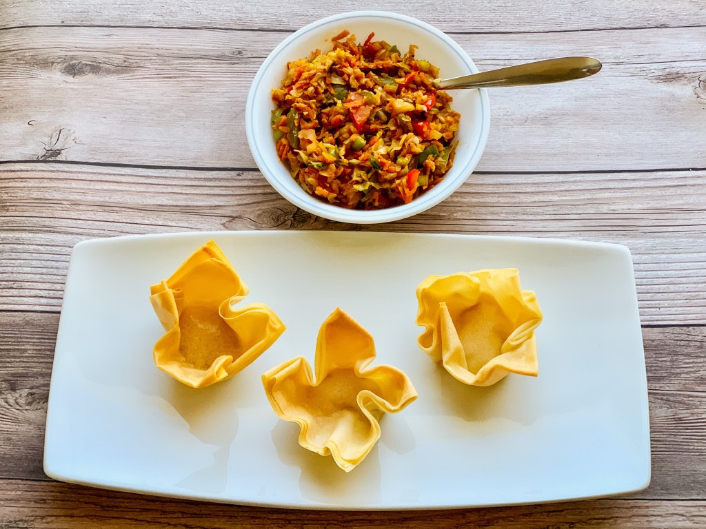 Meat lovers can prepare ground meat (chicken, pork, or turkey) stuffing with soy sauce, sesame oil, and ground pepper. Stuff the baked cups with the meat filling and enjoy them as deconstructed baked wontons. I’m going to try ground chicken baked wontons next time.
