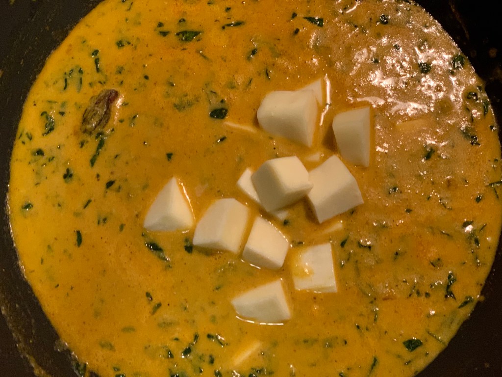 - Add paneer cubes, mix well carefully, and cook the paste for two minutes on a low to medium flame.