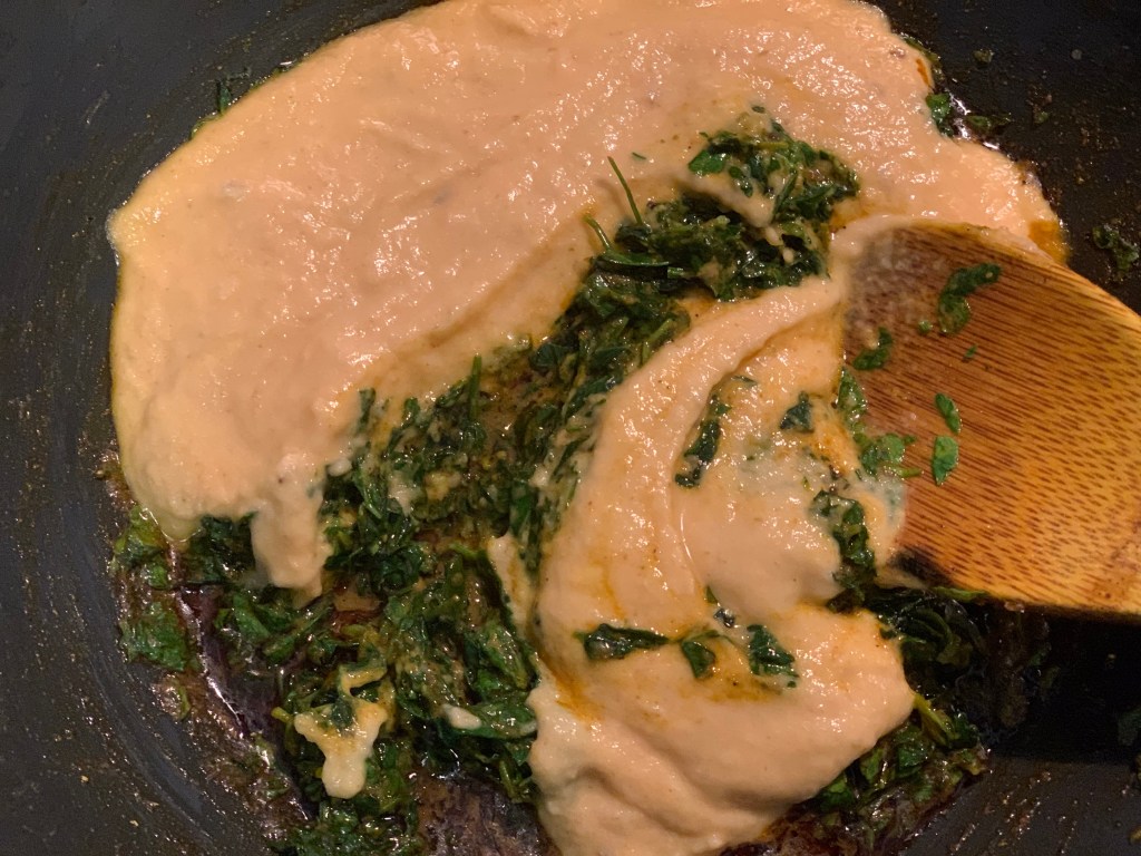 - Add Fenugreek leaves and mix well. Sauté the leaves for a couple of minutes, as shown in picture #4.