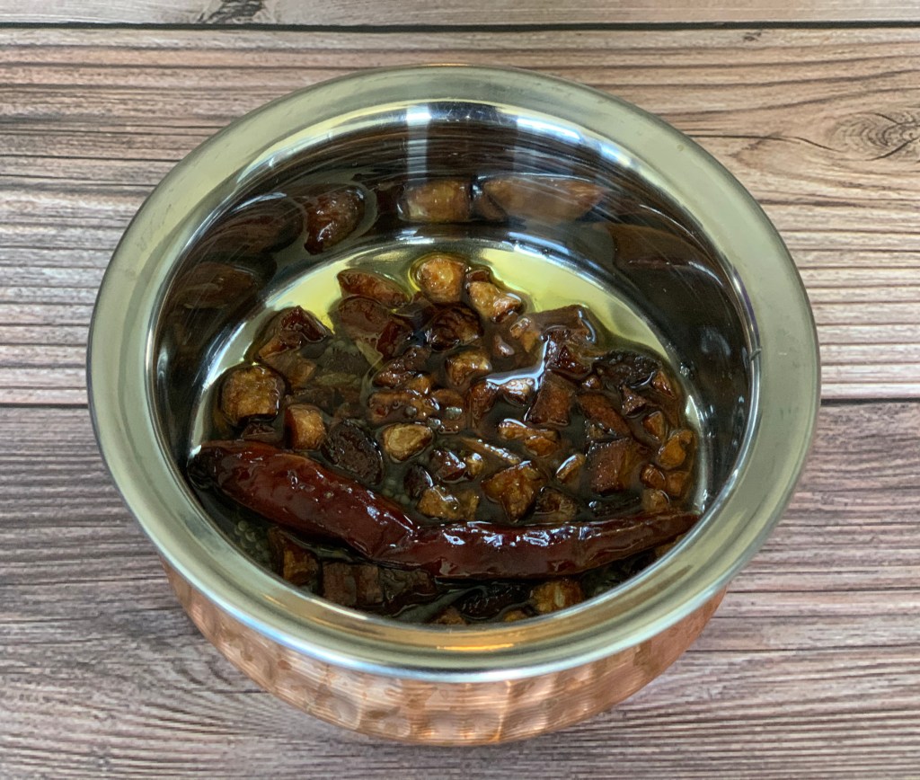 - Next, fry dried red chili in the same oil for a minute and transfer it in the bowl with garlic.