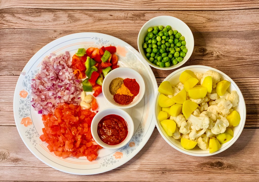 (If you don’t have colored bell peppers, use green bell peppers and add some carrots. Sometimes I skip red & yellow peppers and add french beans, green peas & carrots for the variation, as shown in picture #3. Reduce the quantity of cauliflower to 2 cups and replace it with 1/2 cup of chopped beans, carrots, and peas.) - One large tomato.