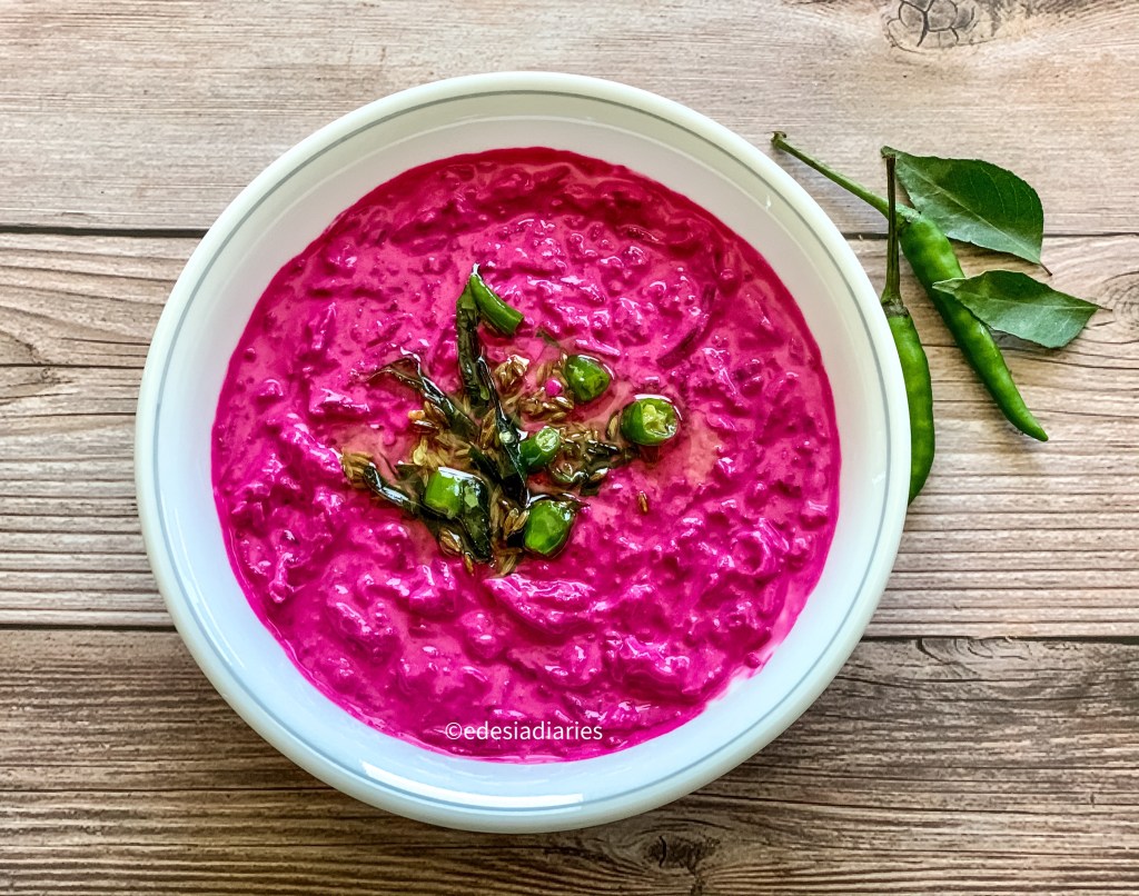 It’s a simple cooling side dish and a perfect accompaniment to a spicy meal. Beetroot and yogurt combination adds a beautiful pink color to the raita. The addition of green chilies, curry leaves, and cumin seeds seasoning enhances the taste of the colorful beetroot raita.