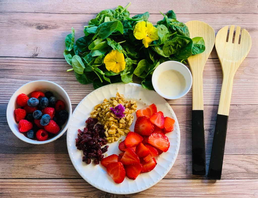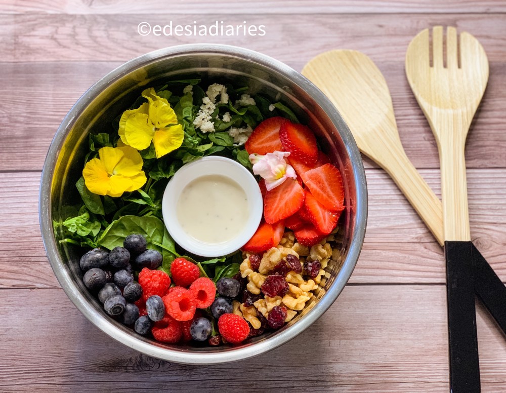 - Top the salad with edible flowers, and enjoy the colorful salad. It’s a perfect recipe for July 4th, as it has red green and blue colors.