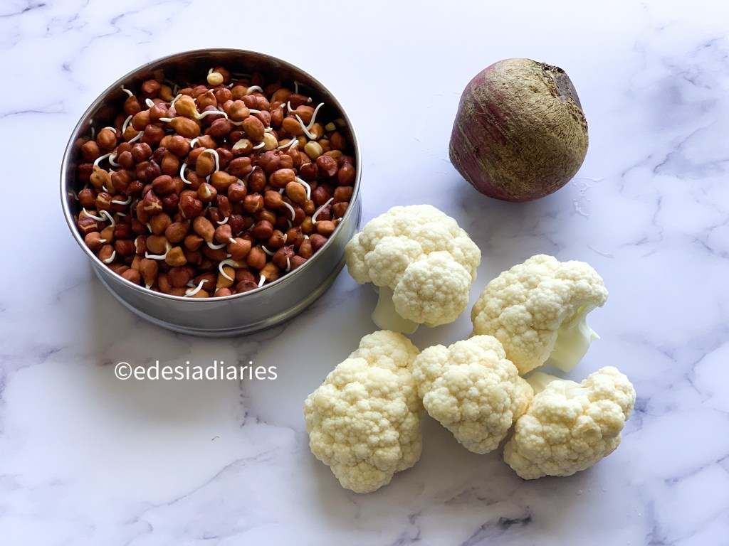 Chana Sundal, beetroot poriyal, and tandoori cauliflower salad is a fulfilling salad that will tickle all your taste buds. Meat lovers can also use tandoori chicken instead of tandoori cauliflower.