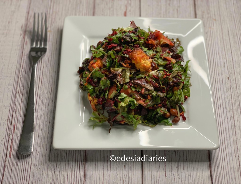 Introducing one more incredibly delicious salad signature recipe that I came up with. Rang barse (Showering of colors) salad, made with black chana sundal, beet poriyal, tandoori cauliflower, greens, and then tossed with spicy and zesty lemon dressing. Beetroot salad with tandoori cauliflower salad is fulfilling, healthy, and scrumptious and serves as a full meal.