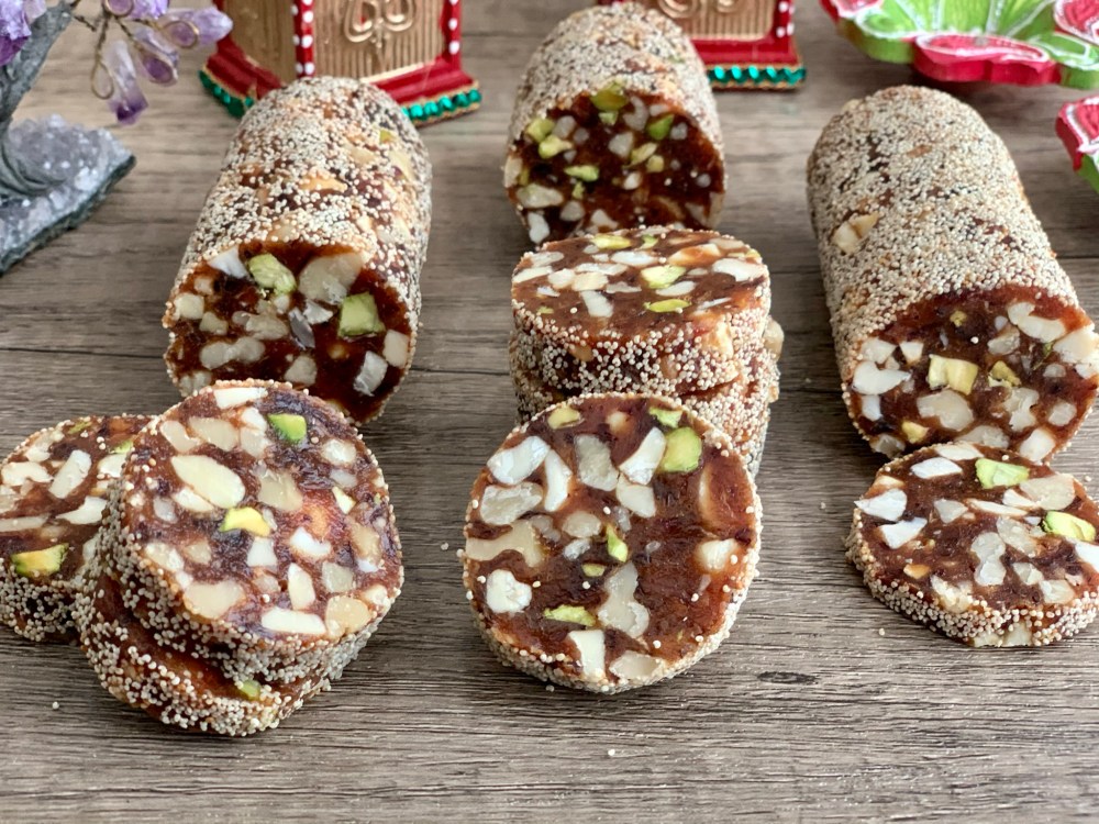 I prefer to use poppy seeds for the Dates-Nut roll recipe, but you can substitute white poppy seeds with desiccated coconut if it’s hard to find it. These rolls last for a month in the refrigerator. Sometimes I like to add pistachio pieces for adding more color to the dessert.