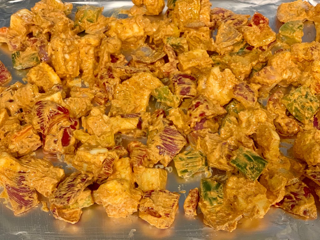 - Mix everything well. Next, add cauliflower florets, bell peppers, onions, and paneer cubes to the yogurt mixture, as shown in picture #1. Let it marinate for 30-45 minutes.