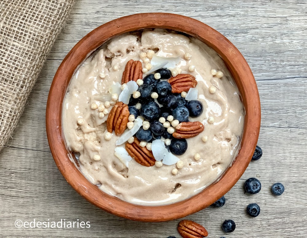 Treat or not to treat? The answer is, always treat when it comes to this #NoSugarAdded delightful delicacy. Mango nice cream smoothie bowl topped with fresh #blueberries, nutty #amaranth #puffs, edible flowers, coconut flakes, and delicious #banana is another guilt-free dessert. It’s also a good breakfast option during the summertime and takes only a few minutes to prepare with the help of a high powered blender @vitamix